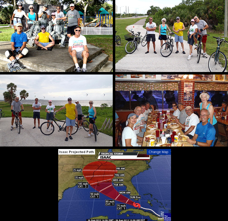 Another Beautiful Day in Paradise. Well....it was a little windy out of the NE. Absentee Andrew F came and Jeff brought his sister Carol. Welcome all. We decided we would do our standard Ft. Desoto route. Head South, do the sub division and go East at the T to the East end and back. As the wind was out of the NE heading South was a snap. Going to the East end was a lot tougher. Heading North back over the bridge was really a challenge. All the 7 bicyclers did the whole 11.9 miles. The two bladers skipped the East end. Looks like Issac won't get here until tomorrow and it doesn't look like Issac will be too terrible.