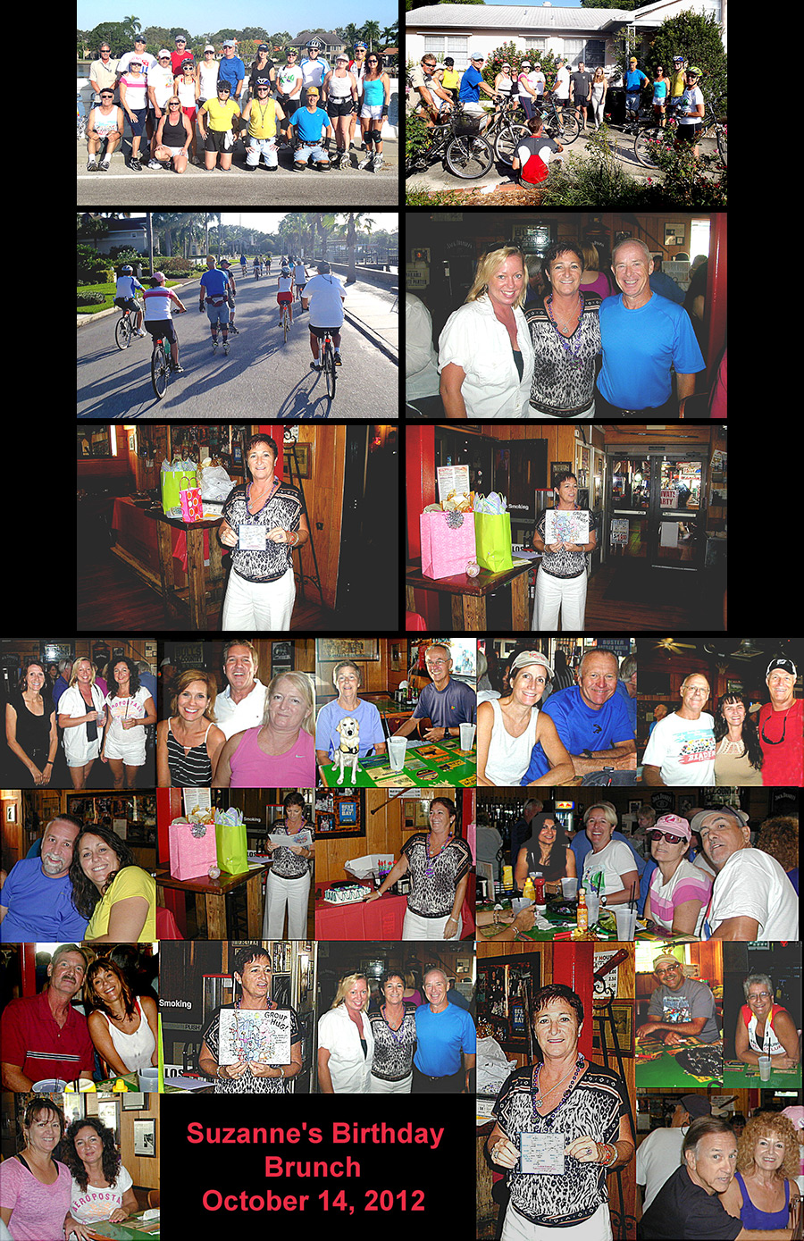 We had the Suzanne B Surprise Birthday Brunch as planned at Fergs. We passed around a big Happy Birthday Card that Sam had provided. Hopefully most everyone got to sign it. A big group were gathered at Ferg's when Suzanne arrived. She did look surprised when she walked in. Fergs had a 10 rated Brunch prepared for all and we had a grand time devouring it. After Brunch Suzanne looked at her cards and opened presents. Naturally we sang Happy Birthday to her. Thanks Jim and Suzanne for a wonderful time.